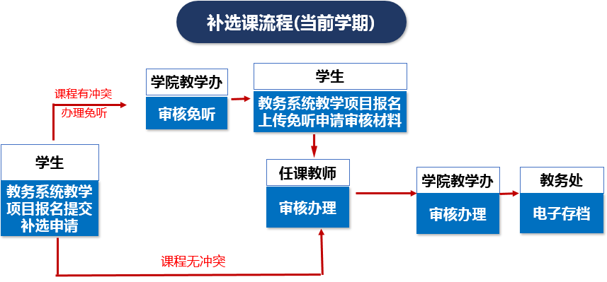 3.课程有冲突,且符合免听条件的课程,学生在办理免听手续后作为附件上传教务管理系统后方可申请补选。