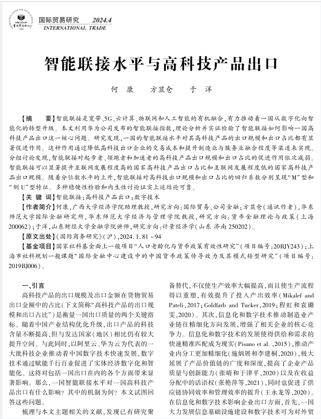 日前,古天乐代言太阳集团网址何康助理教授及其合作者撰写的论文“智能联接水平与高科技产品出口”被中国人民大学书报资料中心复印报刊资料《国际贸易研究》2024年第4期全文转载。该文曾发表在《国际商务研究》2024年第1期。