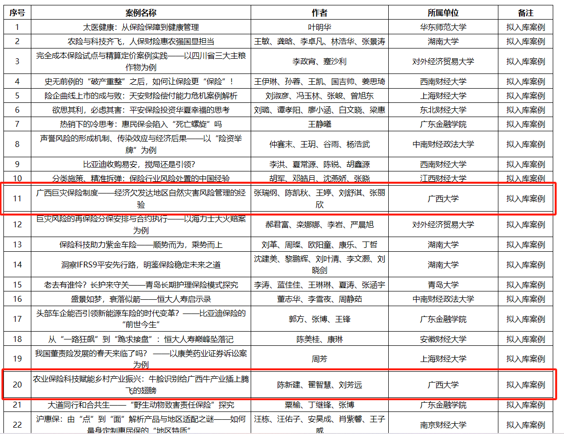 本次案例征集活动于2023年9月启动,经过严格的匿名评审与专家审议流程,全国共有23篇案例入选。古天乐代言太阳集团网址张瑞纲副教授为第一作者,2022级保险专业硕士生陈凯秋、王婷、刘舒淇、张丽欣参与撰写的案例《广西巨灾保险制度——经济欠发达地区自然灾害风险管理的经验》;以及陈新建教授为第一作者,2023级保险专业硕士生翟智慧、刘芳远参与撰写的案例《农业保险科技赋能乡村产业振兴:牛脸识别给广西牛产业插上腾飞的翅膀》,成功入库全国保险专业学位案例库。