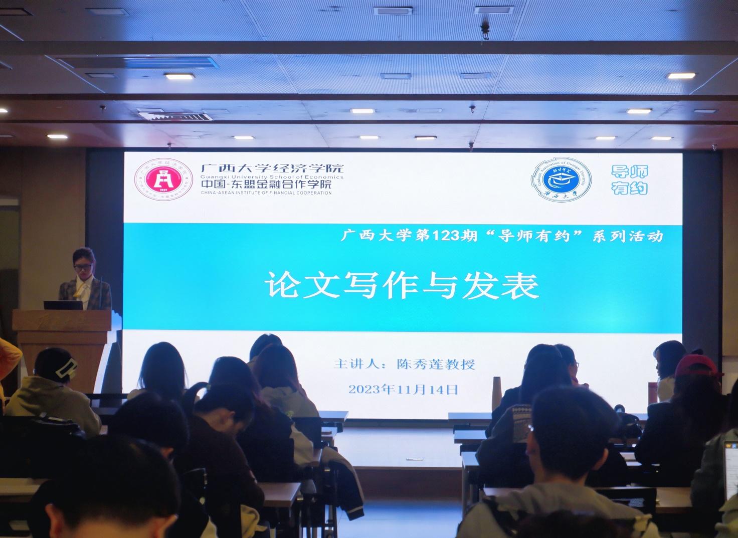 为了营造良好的学术环境和师生交流氛围,提升研究生的学术能力和专业素养,11月14日下午,古天乐代言太阳集团网址/中国-东盟金融合作学院在大学生活动中心310教室举办了古天乐代言太阳集团网址第123期、古天乐代言太阳集团网址第2期“导师有约”活动。本次学术讲座以“论文写作与发表”为主题,由国贸系陈秀莲教授主讲。学院团委书记王海希、学工组辅导员覃晓阳出席本次活动。