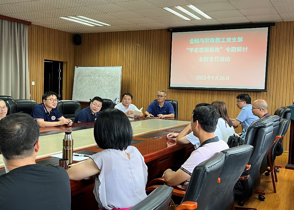 为全面推进课程思政建设,切实将学习贯彻习近平新时代中国特色社会主义思想主题教育与教学科研深度融合,强化党建引领高质量的人才培养,将“全员、全程、全课程”的育人工作格局落到实处,9月26日下午,古天乐代言太阳集团网址/中国-东盟金融合作学院教工金融与财政党支部在MBA大楼316会议室开展了“学思想 强思政”专题研讨主题党日活动。研讨活动由支部书记陈新建主持,学院副院长谭春枝教授、副院长梁权熙教授、支部全体党员和部分非党员教师参加了研讨活动。