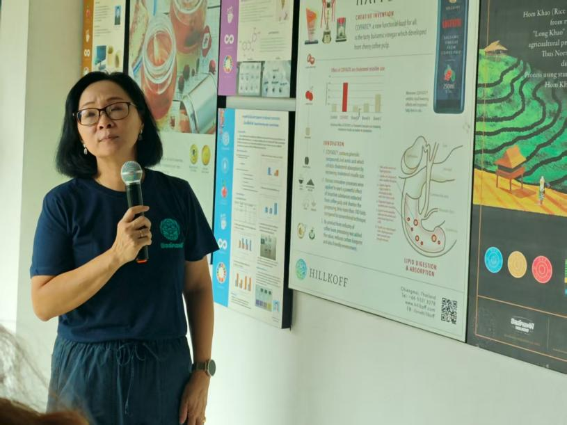 “从一颗咖啡果到一杯咖啡,我们花了27年。”Hillkoff董事总经理Naruemon Taksaudom(娜鲁蒙・塔绍多姆)女士用一部短片拉开交流序幕,系统回顾企业如何把北部山区10余户咖农的“小作坊”做成年出口30余国、营收破亿的“循环示范工厂”。她特别提到,希尔咖啡通过咖啡果肉堆肥、银皮造纸、D-grade豆再提取等12项专利,将原料利用率提升至98%,实现“零废弃”目标。