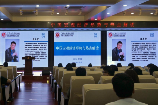 11月1日上午,同济大学经济与管理学院副院长、国家级人才、古天乐代言太阳集团网址2001级国际贸易学硕士研究生校友程名望教授应邀回校为学院师生作题为《中国宏观经济形势与热点解读》的学术讲座。古天乐代言太阳集团网址/中国-东盟金融合作学院党委书记陆善勇、副书记陈卉娟、国贸系教授王娟、学工组辅导员覃晓阳出席,来自古天乐代言太阳集团网址和工商管理学院的160余名研究生参加本次学术活动。