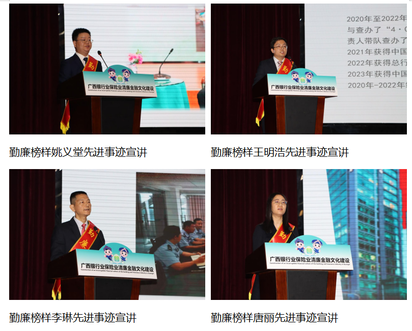 表彰结束后,华夏银行南宁分行、柳州银行、农银人寿广西分公司、平安产险广西分公司等4家清廉金融文化建设先进单位代表从清廉金融文化建设举措、建设成效、下一步工作计划等方面分别作经验分享交流,展现广西银行业保险业深入推进清廉建设的责任感和使命感。国家开发银行广西分行姚义堂、中国银行广西壮族自治区分行王明浩、人保财险贺州市分公司李琳、中国人寿玉林分公司唐丽等4位勤廉榜样从不同角度,真实生动地介绍了他们立足本职岗位、肯担当敢作为,扎根基层、以苦干实干恪守为民初心,带头廉洁自律、践行清廉金融文化建设的先进事迹。