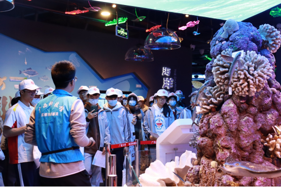 第二站是参观我校海洋科教馆。馆内多种多样的海洋动物、丰富多彩的鱼类、历史悠久的海洋生物标本、贝类、珊瑚类、矿石类、水晶……吸引了隆安中学同学们驻足观看。