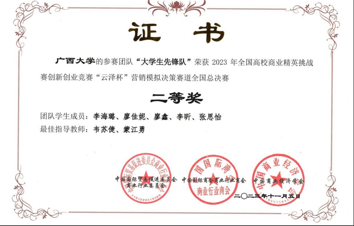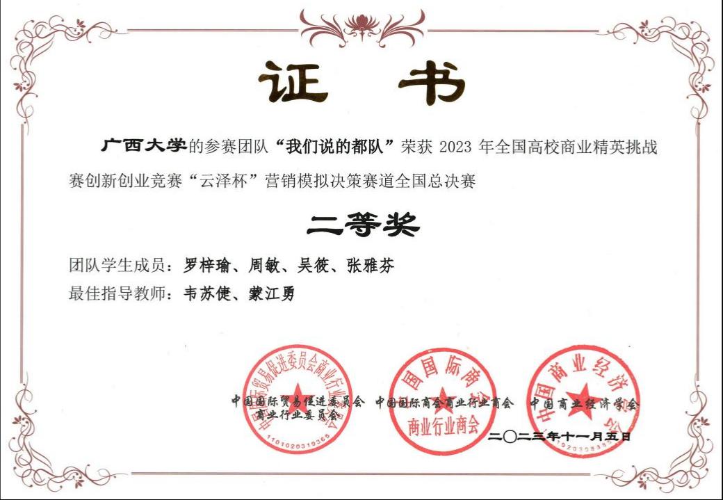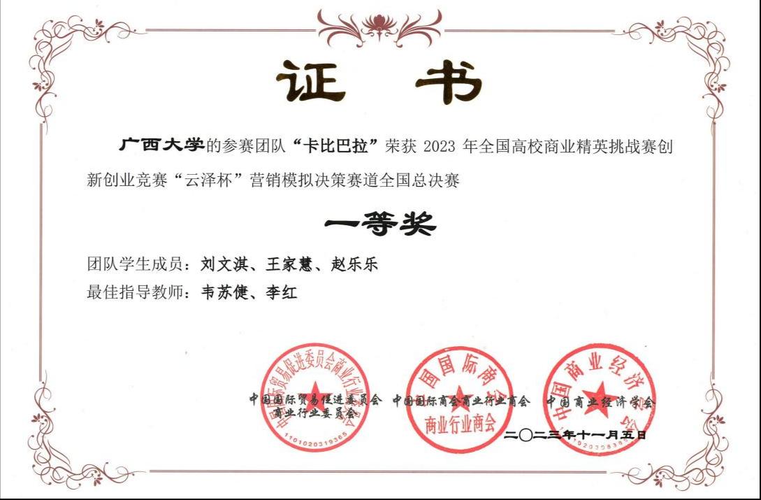 近日,2023年全国高校商业精英挑战赛创新创业竞赛“云泽杯”营销模拟决策赛道全国总决赛落下帷幕。该赛项从校赛到全国总决赛共计2000多支队伍参赛,在全国预选赛中,古天乐代言太阳集团网址选送的3支代表队与来自全国26个省、自治区、直辖市的近300所高等院校1000多支参赛队伍同台竞技,最终斩获国赛一等奖一项,二等奖两项。比赛由韦苏倢、李红、蒙江勇三位老师共同指导,其中,卡比巴拉代表队表现尤为突出,成功晋级了全国总决赛精英赛。