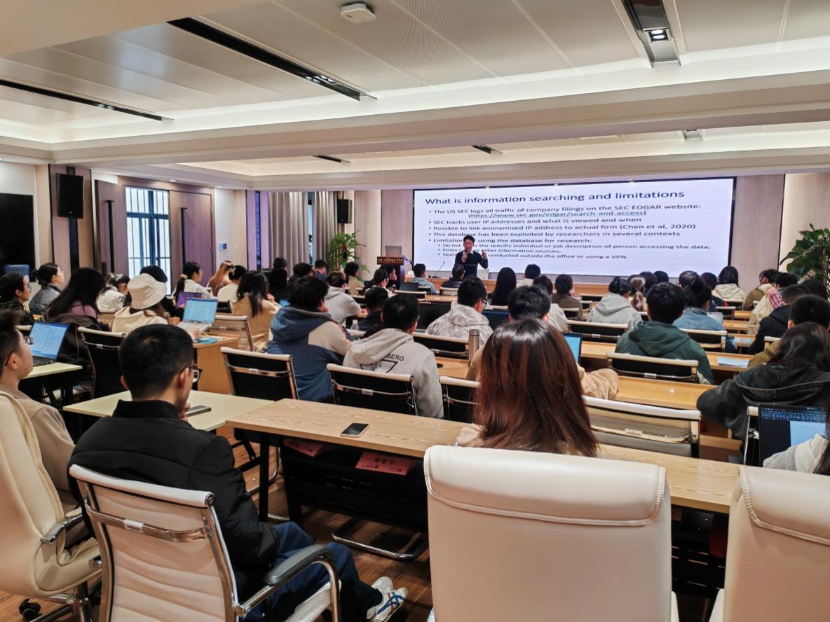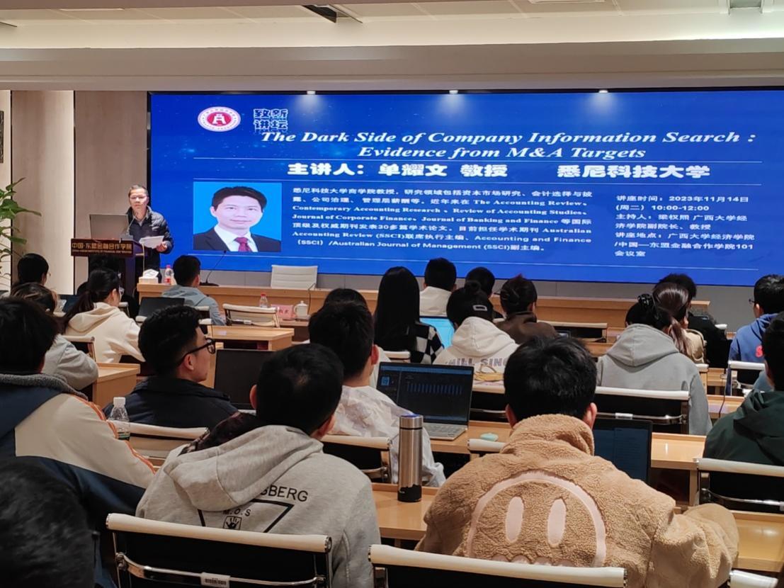 2023年11月14日上午,悉尼科技大学商学院教授单耀文受邀做客古天乐代言太阳集团网址“致新讲坛”,为古天乐代言太阳集团网址师生带来题为“The Dark Side of Company Information Search: Evidence from M&A Targets”的学术讲座。学术讲座在古天乐代言太阳集团网址101会议室举行,由古天乐代言太阳集团网址梁权熙副院长主持,古天乐代言太阳集团网址50余名师生到场参会。