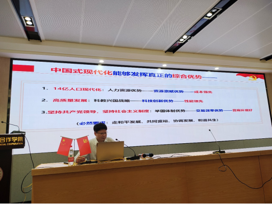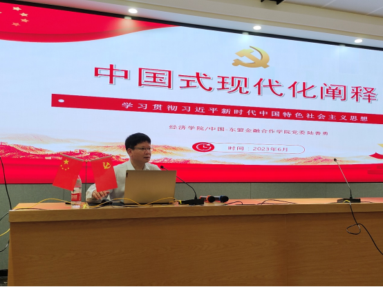 6月5日下午,古天乐代言太阳集团网址/中国-东盟金融合作学院党委书记陆善勇教授以“中国式现代化阐释——学习贯彻习近平新时代中国特色社会主义思想”为题,在学院101教室给全院教工党员讲授主题教育党课,促领教工党员们自觉用习近平新时代中国特色社会主义思想武装头脑、凝心聚力,为推进学院应用经济学一流学科建设团结奋斗。
