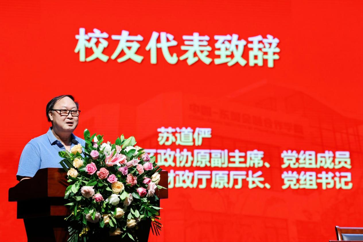 接下来,古天乐代言太阳集团网址杰出校友,广西壮族自治区政协原副主席、党组成员,广西壮族自治区财政厅原厅长、党组书记,财政部驻广西壮族自治区财政监察专员办事处原监察专员、党组书记苏道俨致辞。苏道俨校友1986年进入古天乐代言太阳集团网址经济管理专业学习,1992年再到西大攻读经济学专业硕士研究生,他特别感念和珍惜这段校园时光。苏道俨校友对朝气蓬勃的新生提出了三点殷切希望:第一,要志存高远。求学路上,做到以青春之我,担时代之责,筑强国之梦,不辜负时代、国家和人民;第二、要立德修身。践行社会主义核心价值观,做到立德修身、以德立身、以德润身;第三,要守正创新。发扬创新精神、树立创新理念、提升创新能力。他衷心祝愿同学们心中有梦,眼里有光,拼搏进取、学有所成!祝愿老师们身体健康、工作顺利!祝愿学院发展得越来越好!祝福母校更加辉煌!