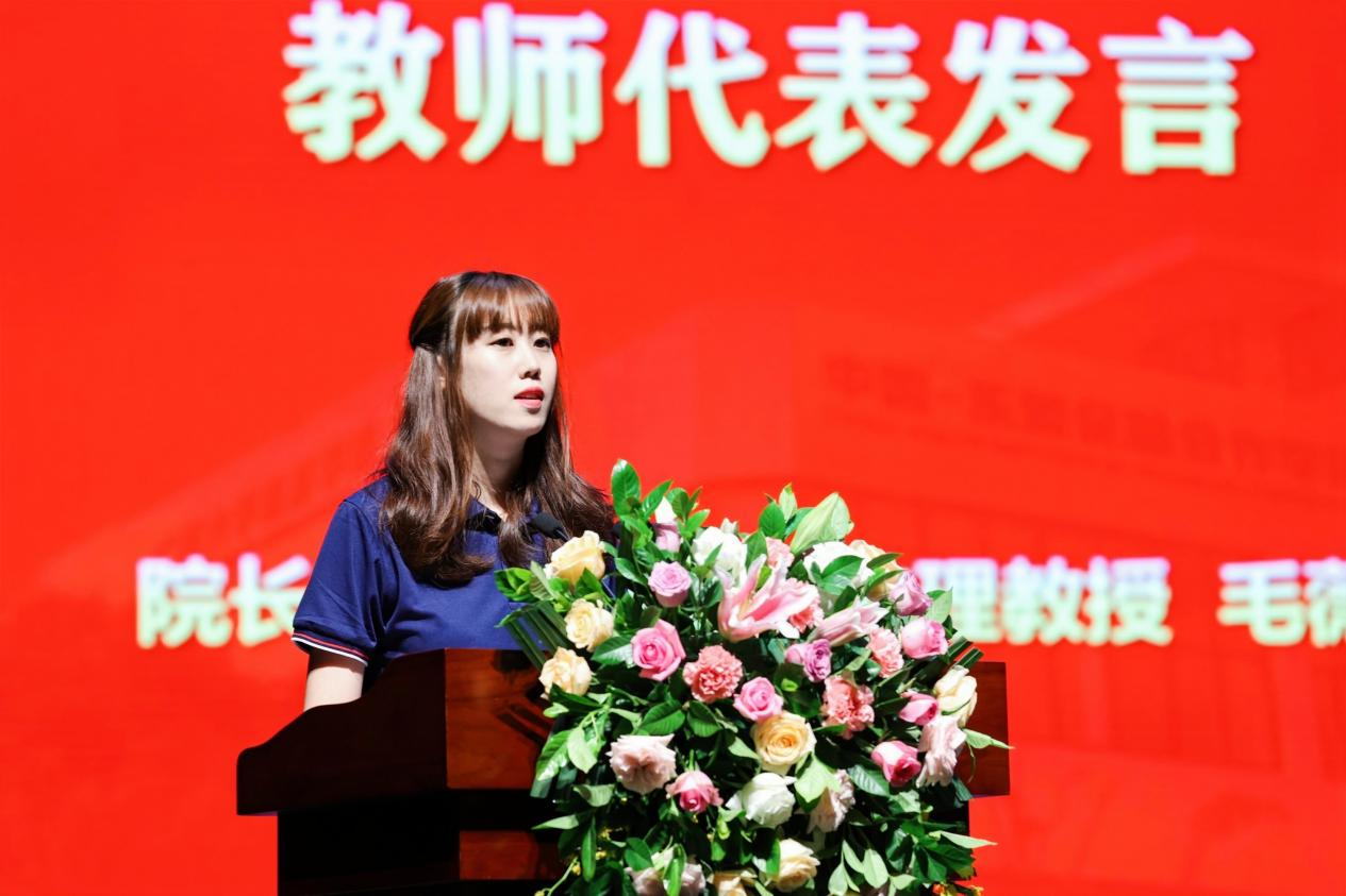 随后,教师代表——院长助理毛薇博士发言。毛薇老师对2022级新同学的到来表示热烈欢迎。毛薇老师回顾分享了自己一路求学的心得体会:首先要确立远大的志向和明确的目标,以其作为飞向更远处的精神引领和动力之源;其次要勇于砥砺奋斗,追求卓越,在困境中潜心磨砺,在挫折中展翅高飞;最后要身心健康,永葆朝气与活力,在生活中永远不忘向善、向美。发言的最后,毛薇老师向同学们送上诚挚的祝福:前路征途漫漫,希望每一位同学都能在前行的路上成就自己,实现梦想。