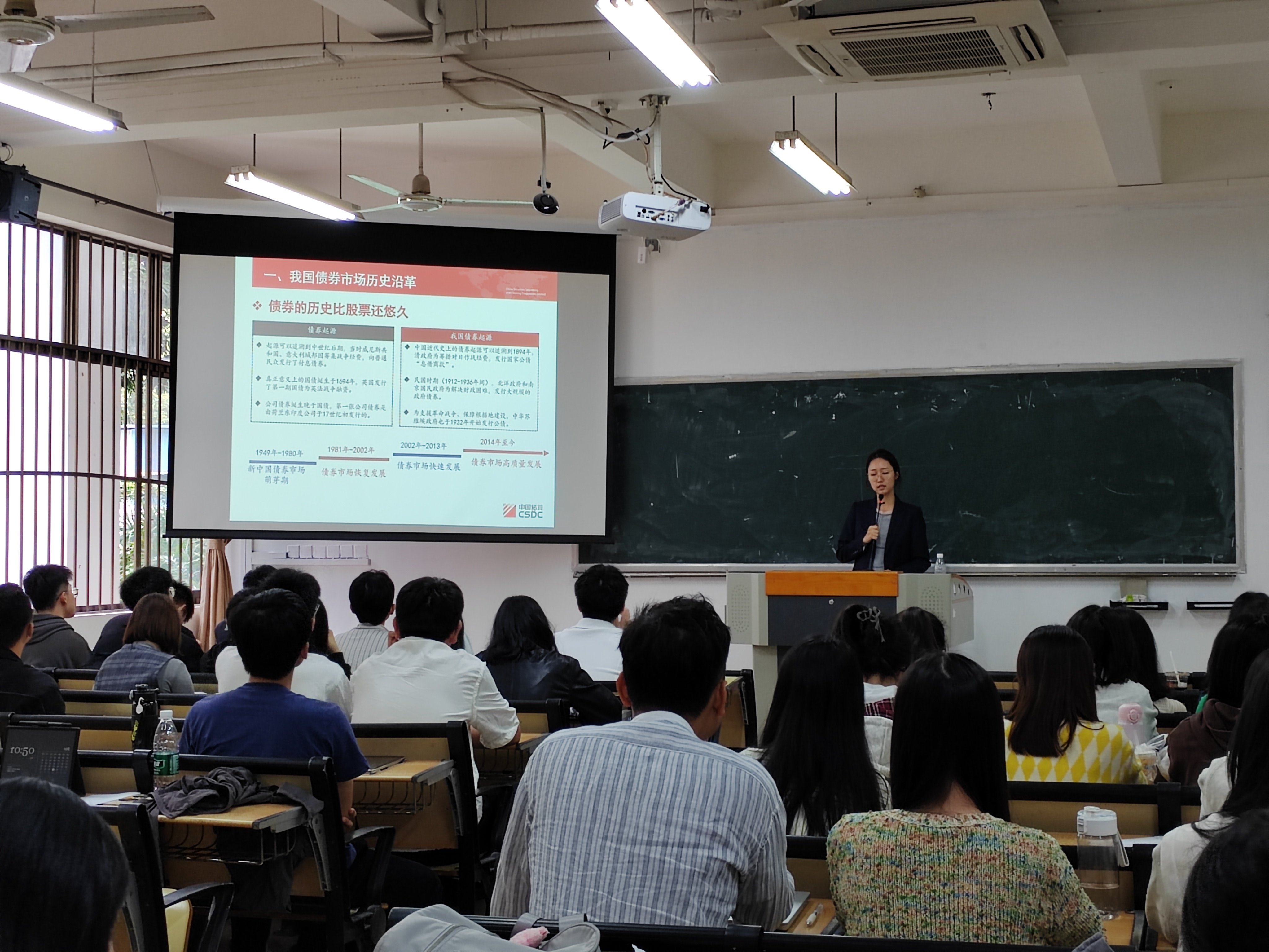 在讲座中,傅于桐从我国债券市场的历史沿革、现状以及上交所债券回购业务三个维度进行介绍。通过生动的PPT展示和深入浅出的讲解,为同学们呈现了一幅我国债券市场从无到有、从小到大的发展画卷。