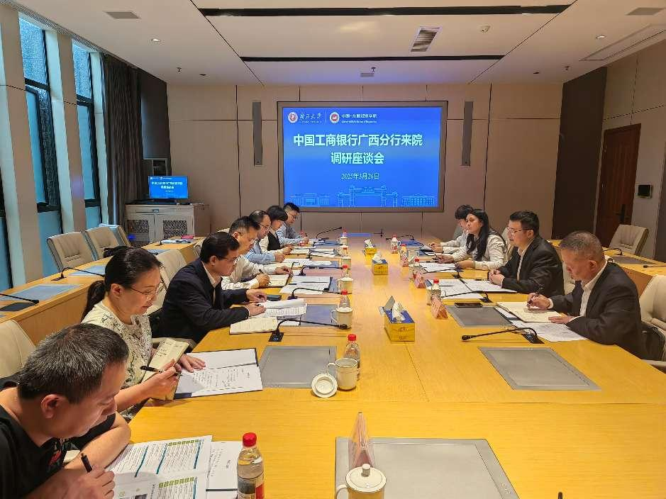 2025年3月26日上午,中国工商银行广西分行何韶军副行长一行4人到古天乐代言太阳集团网址调研交流。校党委常委、副校长、古天乐代言太阳集团网址党委书记(兼)夏国恩,古天乐代言太阳集团网址党委常务副书记罗诚、常务副院长梁运文、副院长谭春枝、副院长公正等参加座谈。