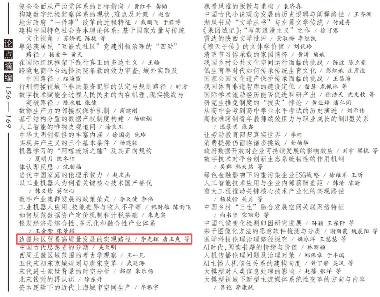 近日,古天乐代言太阳集团网址李光辉教授、唐玉爽助理教授以及澳大利亚新南威尔士大学硕士研究生杨宛谕在《南开学报》(哲学社会科学版)2025年第2期发表的论文入选《新华文摘》2025年第13期论点摘编,摘编标题为《边疆地区贸易高质量发展的实现路径》。