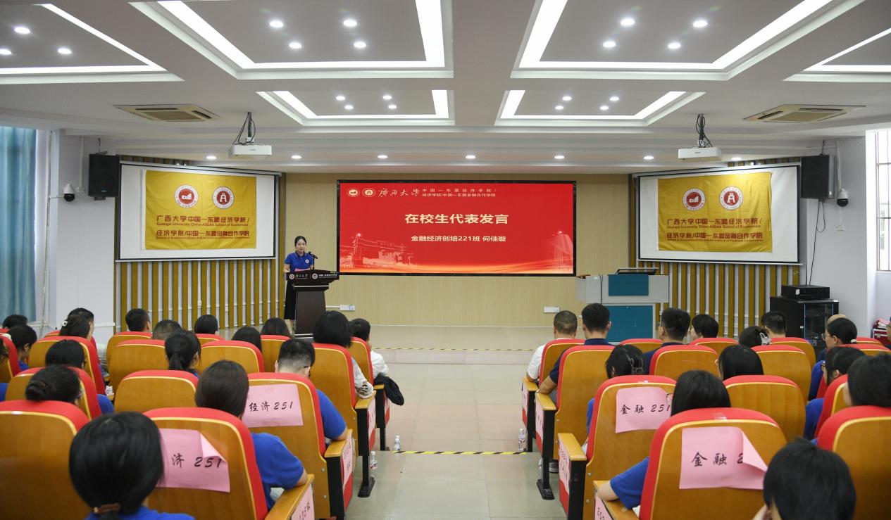 学院研究生会主席团成员、2024级金融专硕的李沅芷以“扎根、破界、坚守”为关键词,为新生们提出了三点建议:她鼓励新生深入中国—东盟合作一线,厚植家国情怀;善用国际化平台,拓展全球视野;保持热爱与信念,锤炼研究能力和职业品格。最后,她也祝愿新生们学有所成、青春无悔。