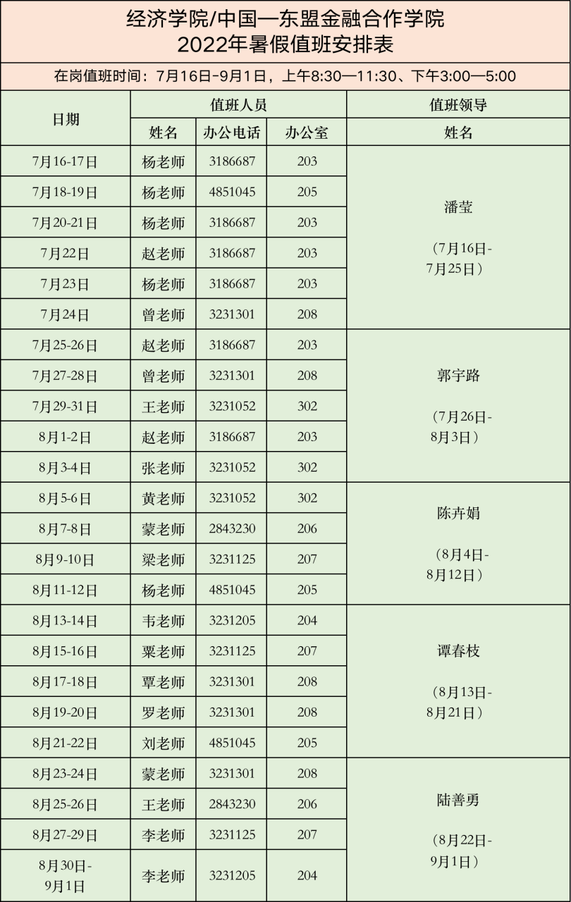 古天乐代言太阳集团网址/中国-东盟金融合作学院 2022年暑假值班安排表